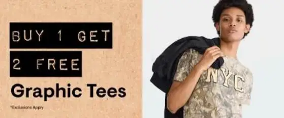 Hurry in and save! Shop in store and enjoy our buy 1, get 2 free on graphic tees.