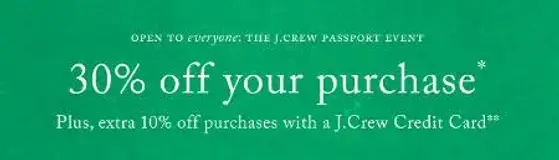 Shop in store and take 30% off your purchase. Plus, extra 10% off purchases with a J.Crew Credit Card.